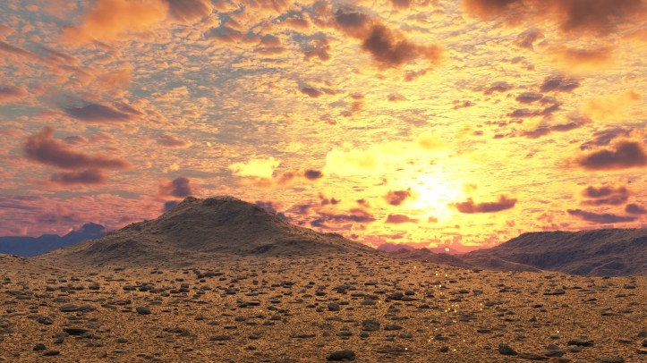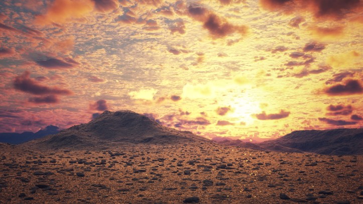 Another Terragen render exploring a mythical land… The ground is littered with gold nuggets, glinting in the majestic sunset.